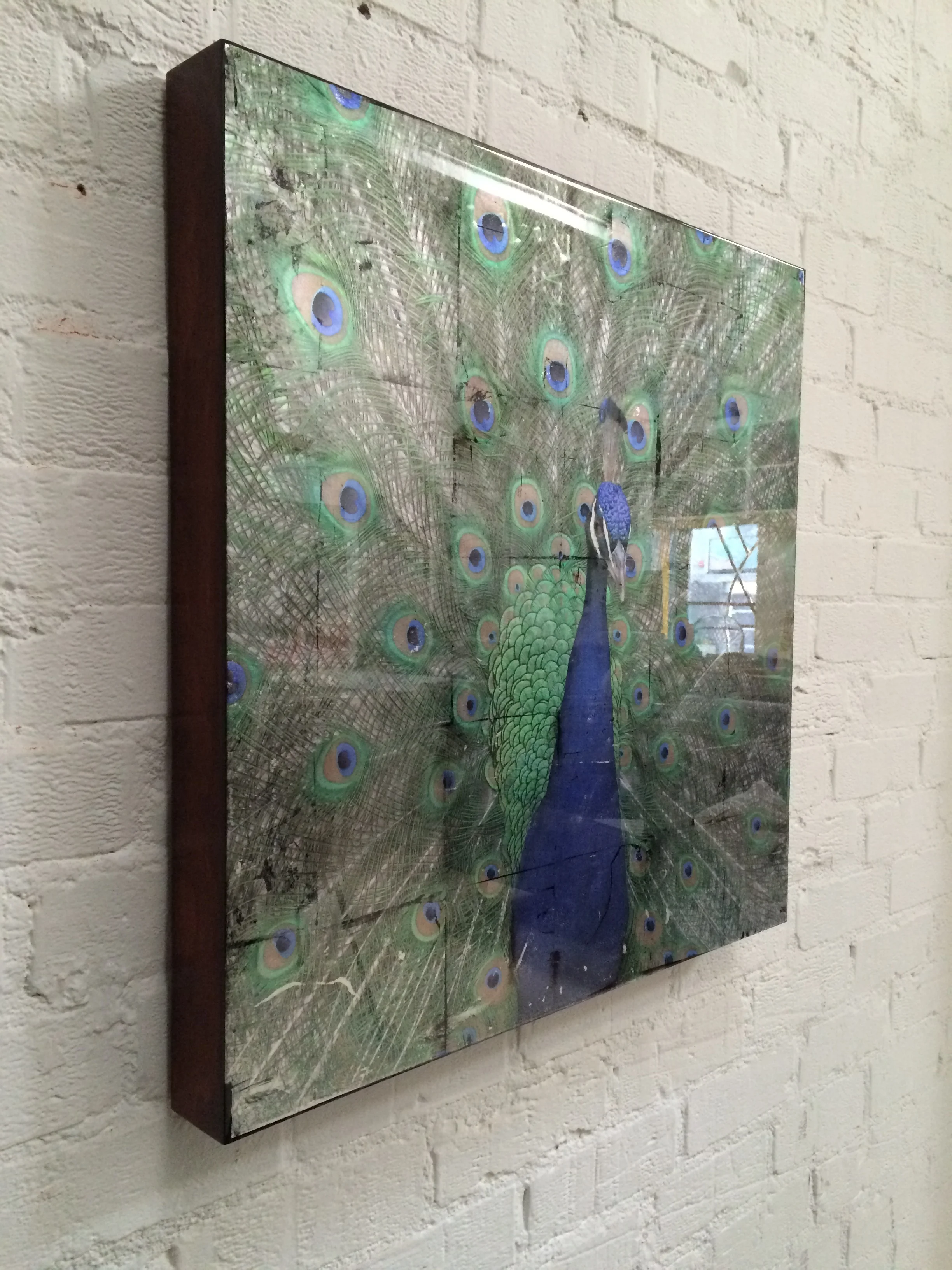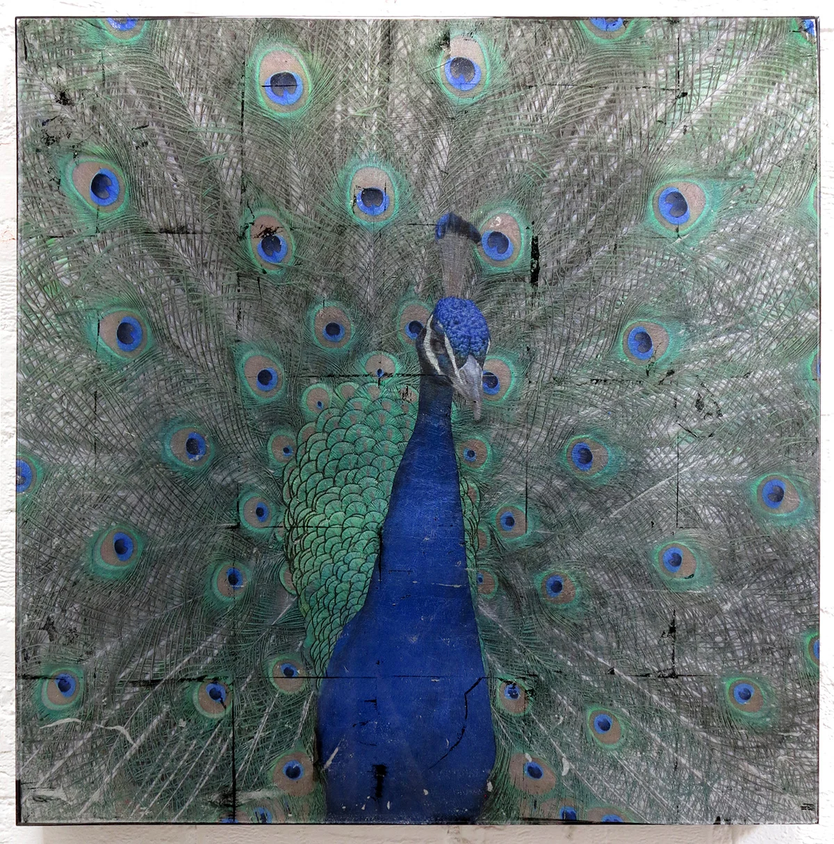 PEACOCK, 30 X 30 X 3 AND 60 X 60 X3, EDITION OF SIX, Mixed Media on Panel, RESIN COATED